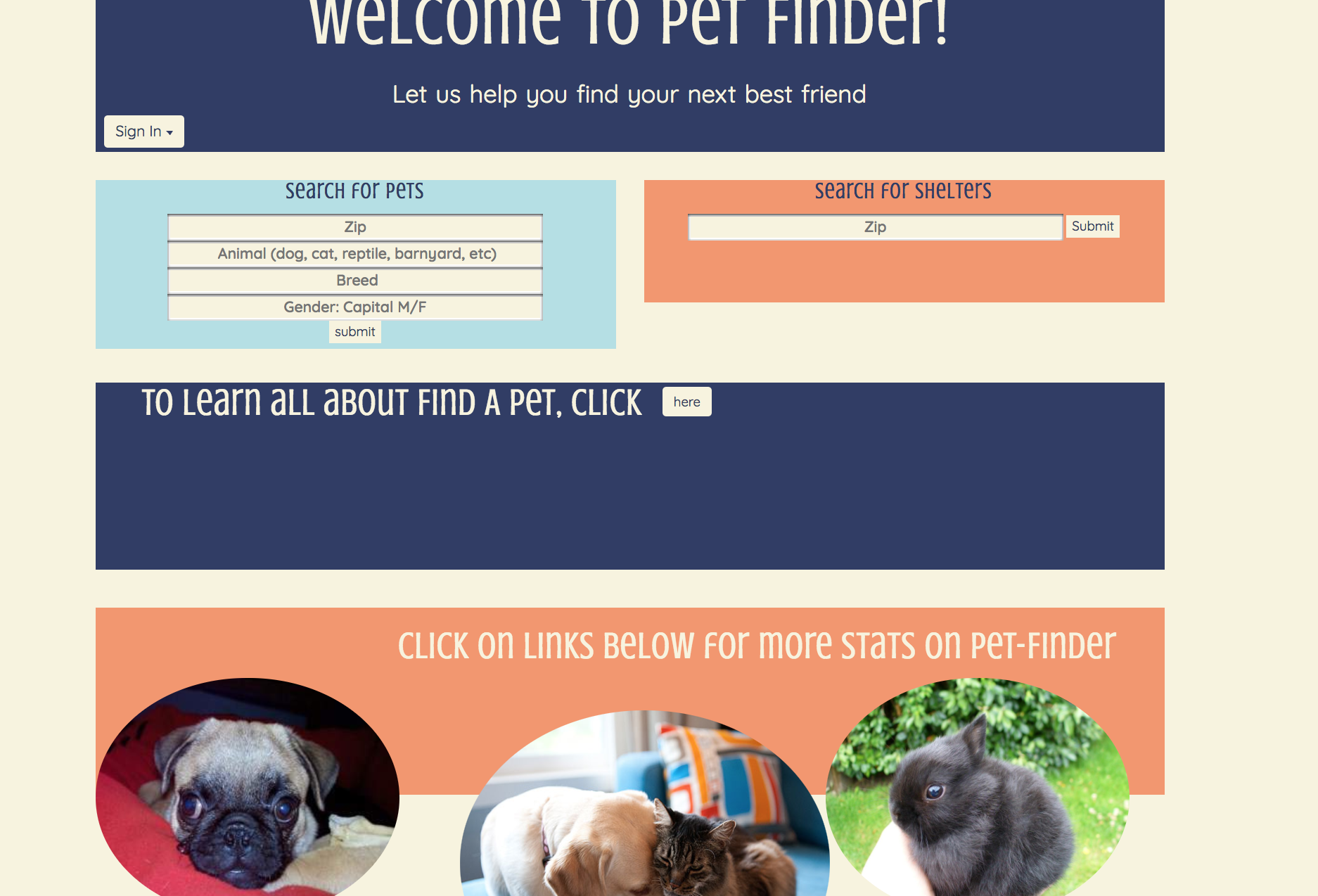 This is a full MEAN stack utilizing API from Pet-Finder, an organization that has a database of all the adoptable domestic animals in the US, and the shelters that house them. Features include two different ways to search; the user can input their zipcode, animal type, breed, and gender from a dropdown menu. The second option enables the user to put in a zipcode and view all the shelters affiliated with Pet-Finder, along with their contact informtion. Once the user is signed in with a valid ID/password, they can create a wishlist of the animals they are interested in getting more information on to save and view at any time. Software/Languages/Frameworks used: MongoDB, Express.js, Node.js, EJS, HTML, CSS, Sessions, Angular.js, RESTful routing { Look at my code } { Live app }