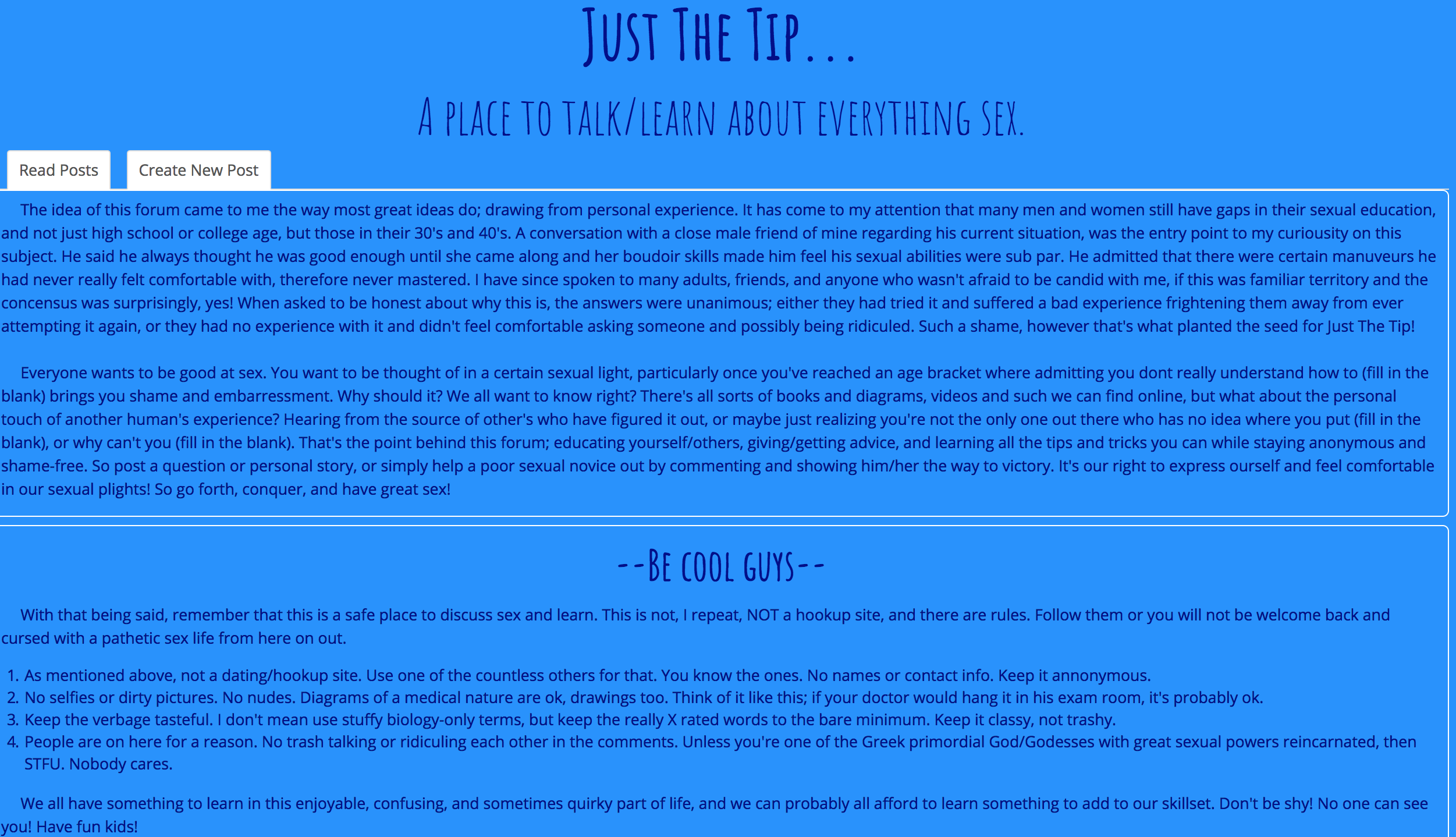An adult advice forum, this app is full CRUD and follows the Rest architectural style, allowing users to submit posts in which they can edit and delete. Users can also comment on posts, which can also be deleted. Software/Languages/Frameworks used: Node.js, Express, EJS, Mongoose, MongoDB, HTML, CSS, RESTful routing { Look at my code } { Live app }